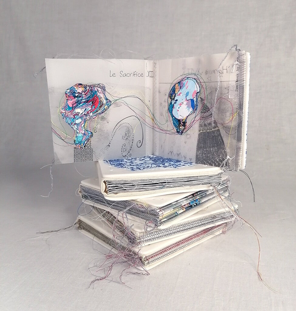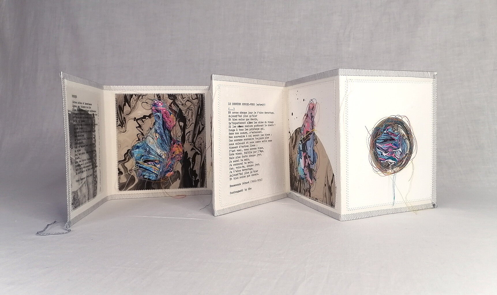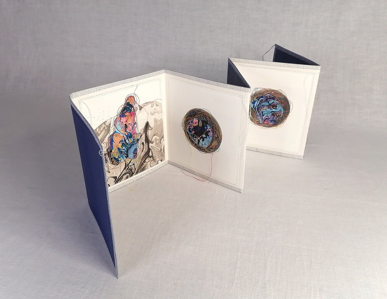 Livret, carnet & leporello réalisés sur base du suminagashi, de collages et du textiles, sur du papier ou autres supports réutilisés et/ou recyclés.