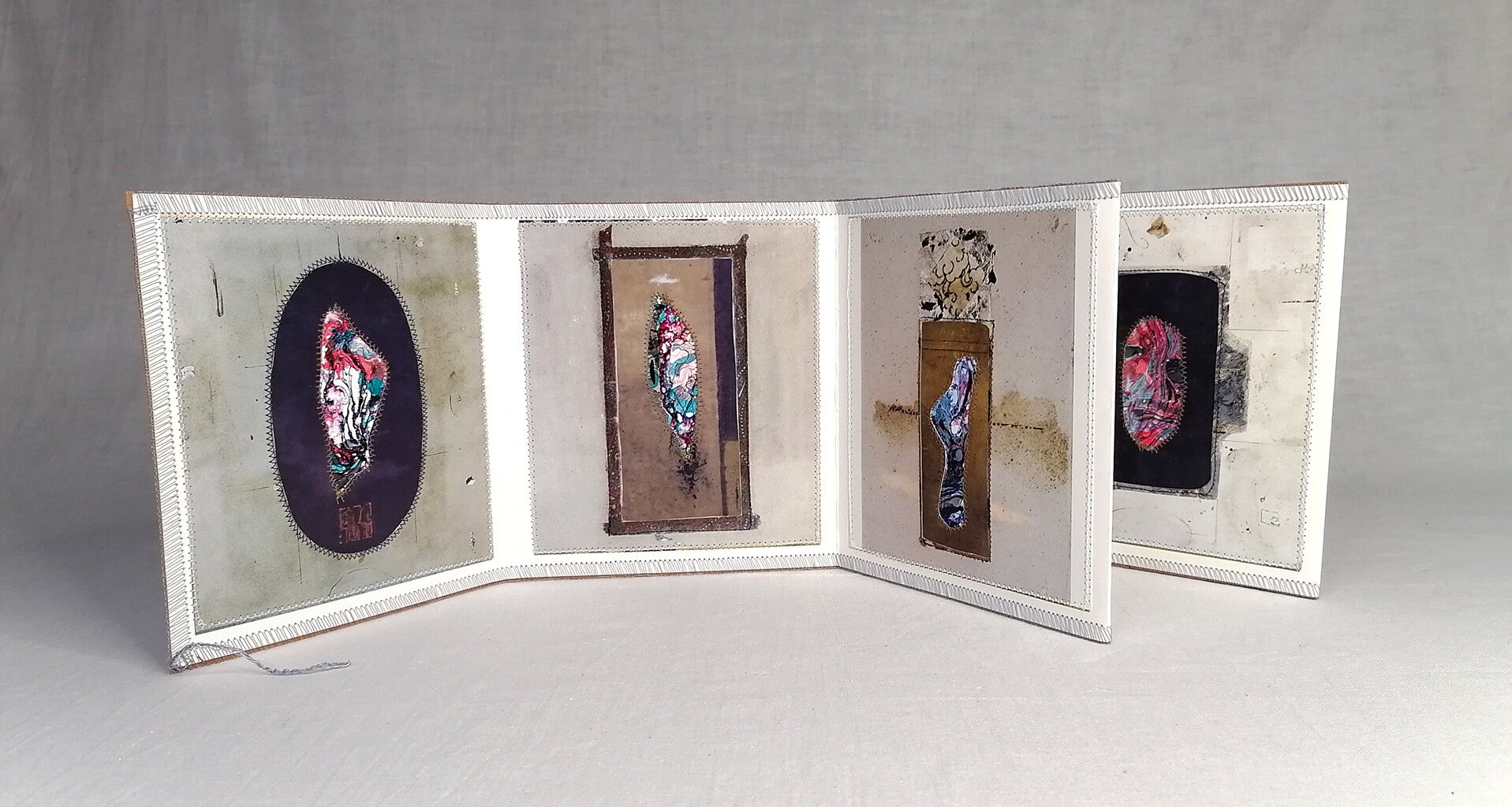 Booklet, notebook & leporello made using suminagashi, collages and textiles, on reused and/or recycled paper or other materials.